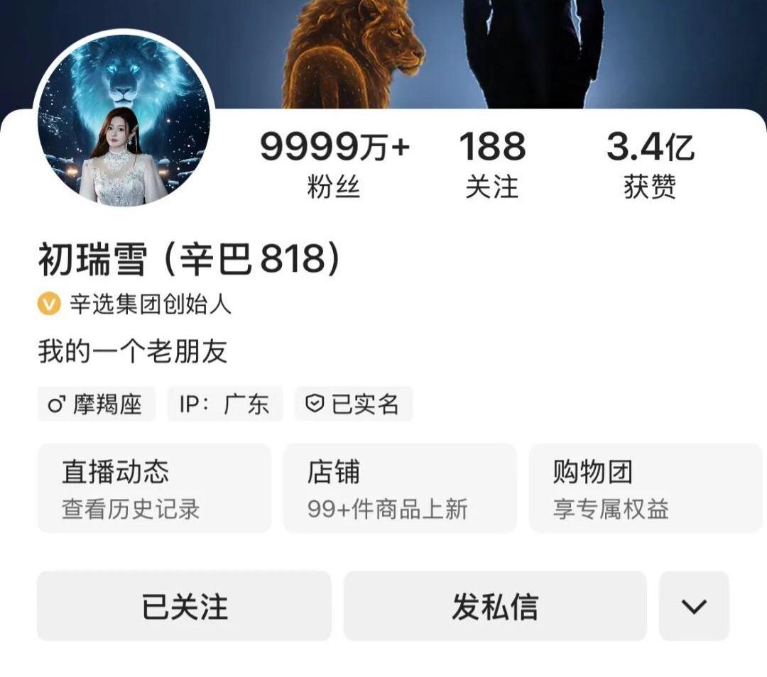 8月21日,该账号过往发布的短视频已全部删除,随后更名为“初瑞雪(辛巴818)”,而且账号头像也已换成初瑞雪的照片。目前该账号认证依然为辛选集团创始人,粉丝数为9999万+,获赞数达3.4亿次。