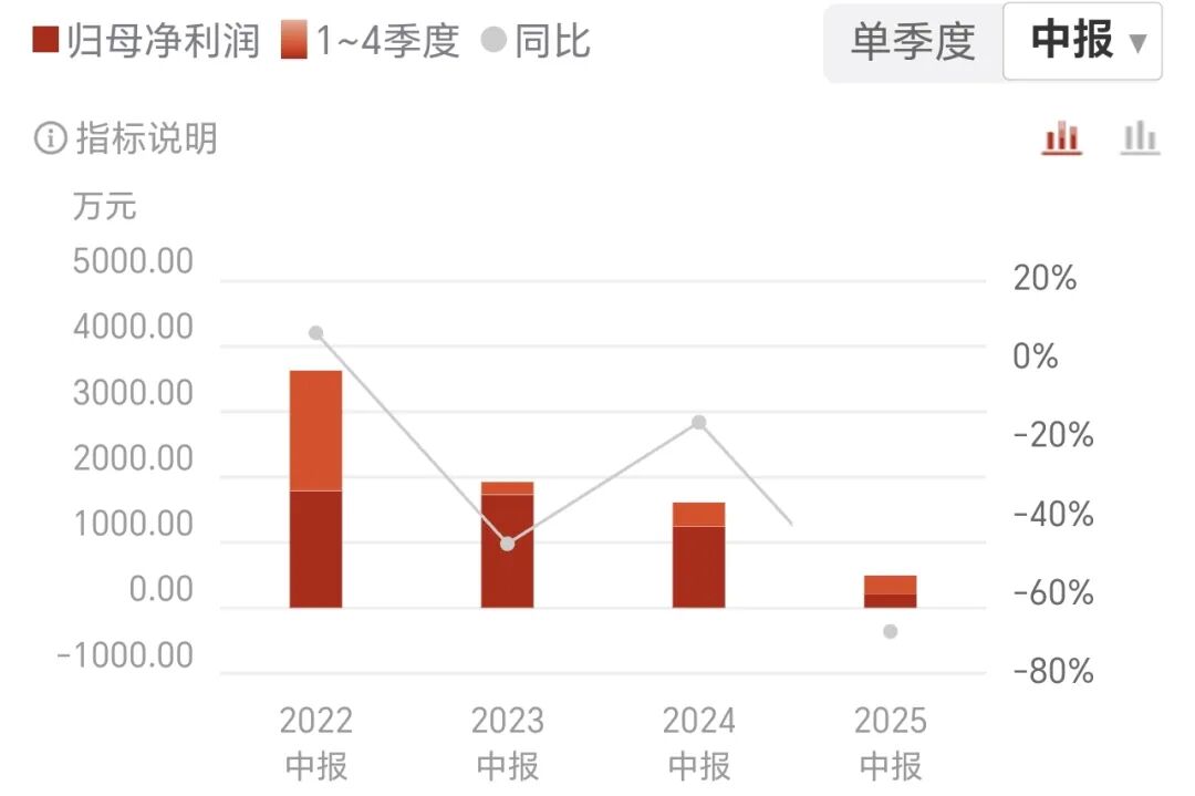 从近年数据看,公司净利润已连续三年同期下滑。2023年上半年归母净利润为1918.11万元,2024年同期降至1606.55万元,2025年上半年进一步缩水至不足500万元,三年间累计降幅超74%。第二季度单季数据显示,尽管营收同比增长19.0%,但归母净利润仍同比下降22.7%,盈利动能未见明显改善。